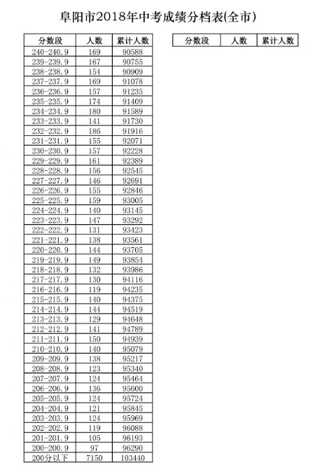 阜阳市2018年中考成绩分档表、普通高中招生建档线出炉